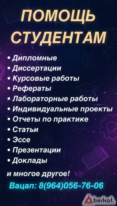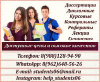 Курсовая работа, дипломная работа, магистерская диссертация, кандидатская, реферат, отчет по практике, дневник практики, научная статья, презентация, эссе, сочинение, изложение, доклад, конспект и многое другое! Быстро, качественно и в срок! Писать на вацап: 8(964)056-76-06
