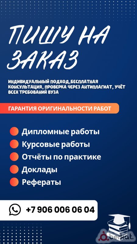 услуги для студентов выполняю на заказ учебные работы: дипломные работы курсовые проекты рефераты доклады отчёты по практике индивидуальный подход, соблюдение сроков и требований. телефон: +7 906 006 06 04